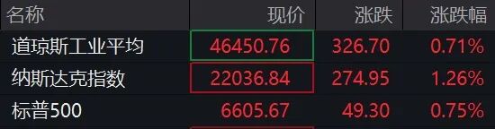 截至发稿,纳指涨1.26%,道指涨0.71%,标普500指数涨0.75%。
